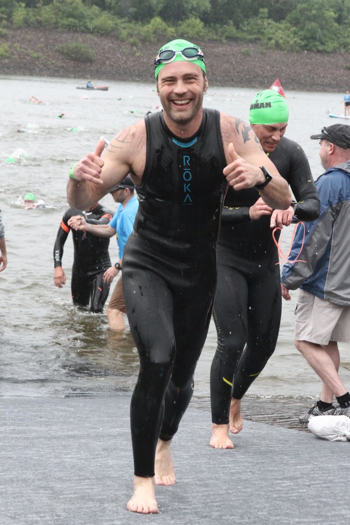 Delivered to T1, I had a little time to setup my bike for the day, then they started calling estimated swim times to group up for the 1+ mile walk to the swim start. While everyone was all lined up in the correct order, things were looking good. As soon as we hit the swim start area, chaos ensued. People went every direction to change into wetsuits, and all measure of swim times went right out the window. I figured there would be signs with swim time estimations for lining up in the corrals, but there was nothing, a complete free for all. Honestly this was the one let down from the event organizers for the race.
