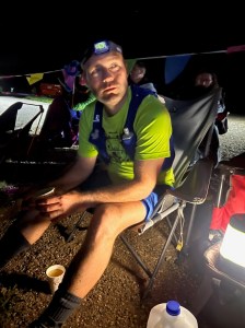 Making it to HWY 12, Jake finds me while I’m trying to stay on my feet to remove a water bottle to fill out. I don’t know how I’ve gotten so unsteady, but he guides me to a chair and takes care of the bottles. I get the watch plugged in, there was 2% left! Just in time. These stops are getting longer, I’m not stretching anymore, just enjoying the few minutes off of my feet. I make sure to get proper food in, just like every other aid station, thankful I’m able to keep eating.